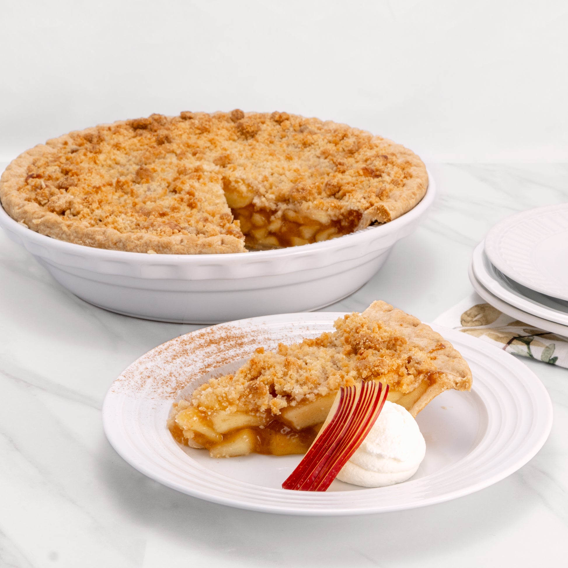 Rich buttery crumb tops crisp sweet apples, tossed in sugar and spices, then baked until golden and bubbly. An instant classic.