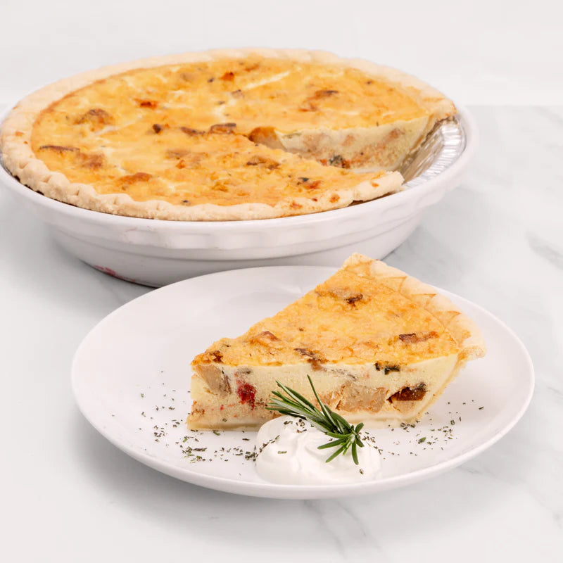 This quiche from Tootie (after all, it's just a breakfast pie), is a savory egg and cream mixture featuring roasted tomatoes, roasted jalapenos, onions, garlic, and roasted potatoes, all layered with a cheddar cheese blend.